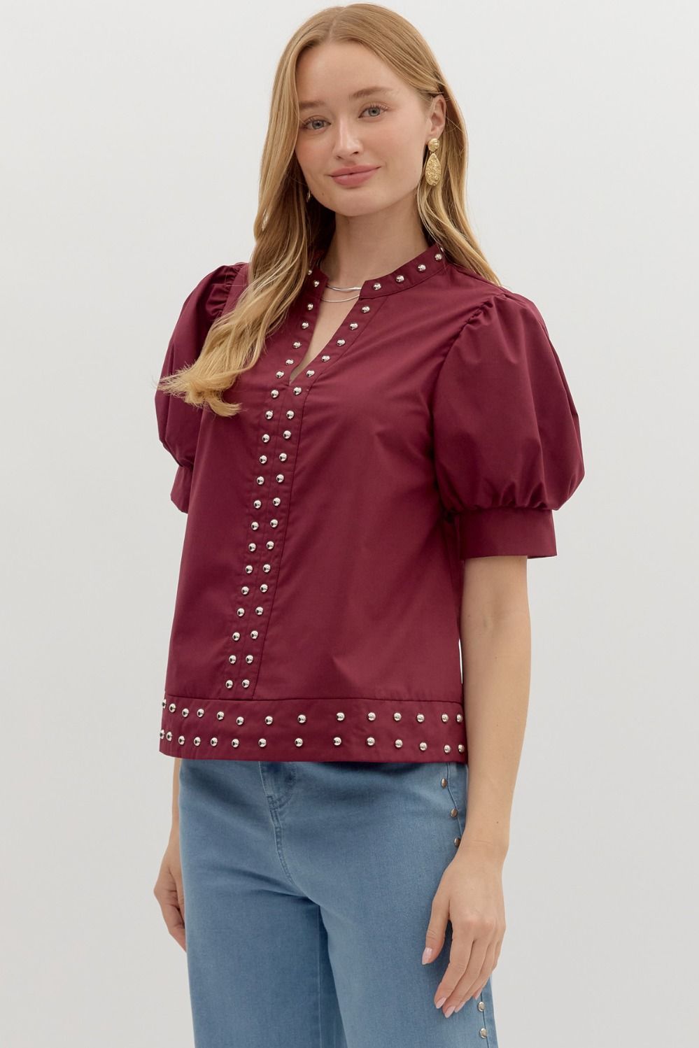 Maroon Silver Studded Puff Sleeve Top