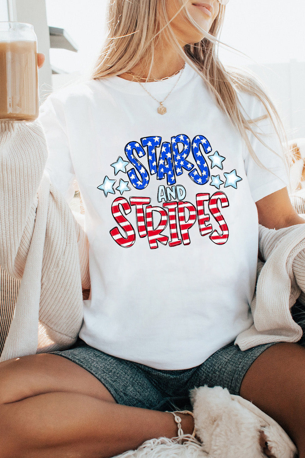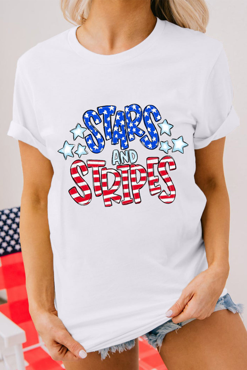 White Stars and Stripes Round Neck Graphic T Shirt